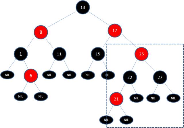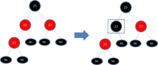 下图所表示的是红黑树的一部分,需要注意节点25并非根节点。因为节点21和节点22连续出现了红色,不符合规则4,所以把节点22从红色变成黑色: