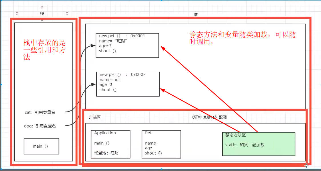 栈中存储的对象名是一个指向堆的内存地址,通过对象名.属性值和对象.方法名来对属性进行修改或者对方法进行调用