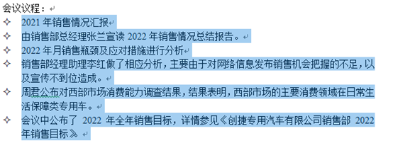 6. 选中“会议议程”中的内容,单击开始选项卡中段落选项框中的项目符号的下拉选项框,选择需要的会议符号即可
