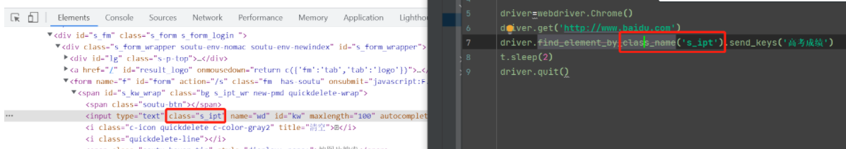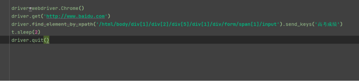 driver=webdriver.Chrome() driver.get('http://www.baidu.com') driver.find_element_by_xpath('/html/body/div[1]/div[2]/div[5]/div[1]/div/form/span[1]/input').send_keys('高考成绩') t.sleep(2) driver.quit()