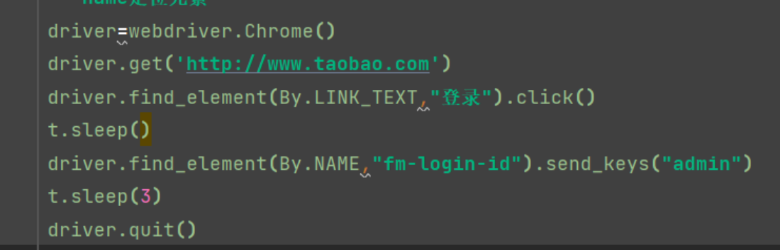 driver=webdriver.Chrome() driver.get('http://www.taobao.com') driver.find_element(By.LINK_TEXT,"登录").click() t.sleep() driver.find_element(By.NAME,"fm-login-id").send_keys("admin") t.sleep(3) driver.quit()