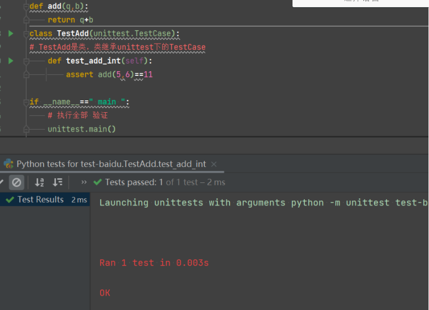 class TestAdd(unittest.TestCase): # TestAdd是类,类继承unittest下的TestCase def test_add_int(self): assert add(5,6)==11 if __name__==" main ": # 执行全部 验证 unittest.main()