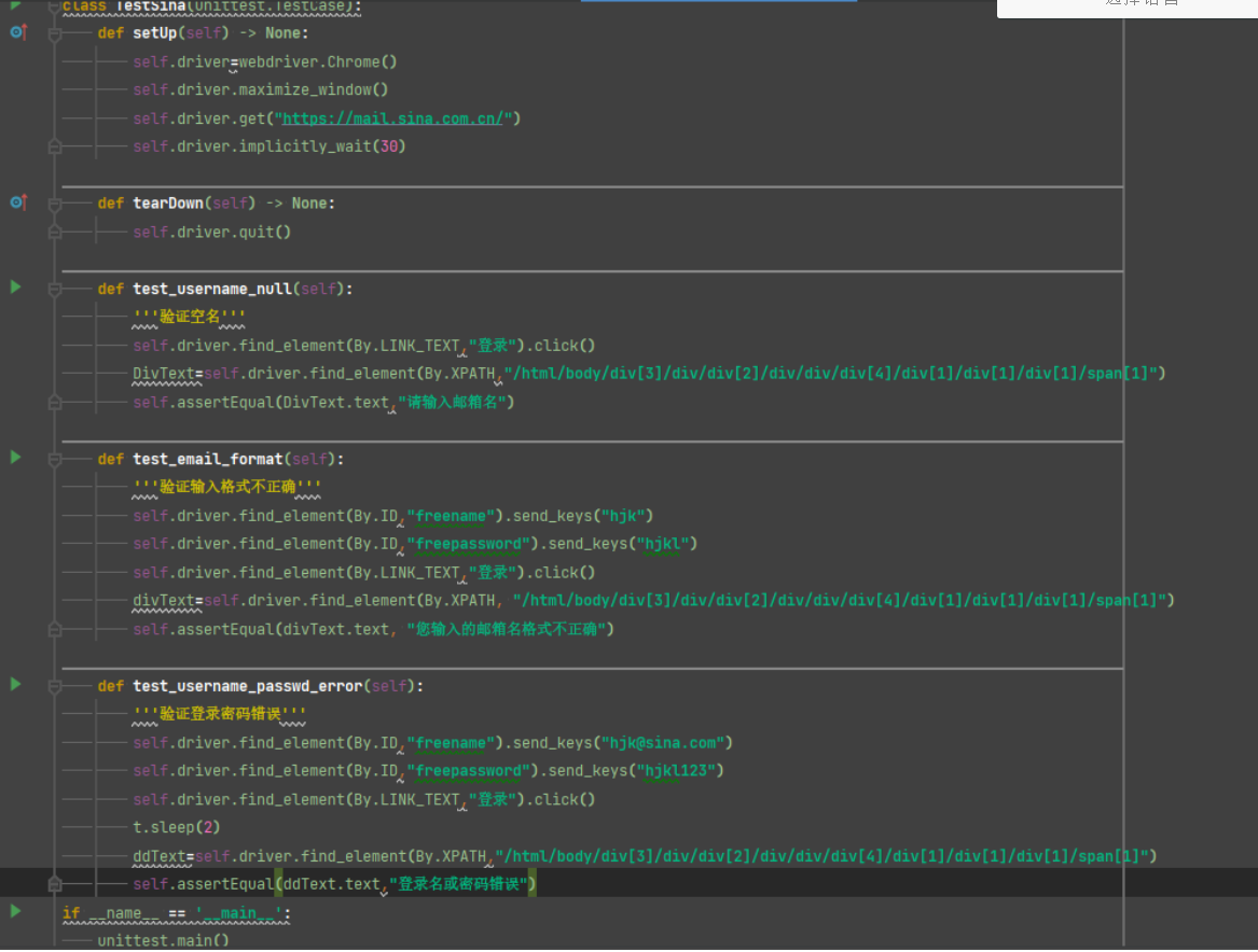 import time as t class TestSina(unittest.TestCase): def setUp(self) -> None: self.driver=webdriver.Chrome() self.driver.maximize_window() self.driver.get("https://mail.sina.com.cn/") self.driver.implicitly_wait(30) def tearDown(self) -> None: self.driver.quit() def test_username_null(self): '''验证空名''' self.driver.find_element(By.LINK_TEXT,"登录").click() DivText=self.driver.find_element(By.XPATH,"/html/body/div[3]/div/div[2]/div/div/div[4]/div[1]/div[1]/div[1]/span[1]") self.assertEqual(DivText.text,"请输入邮箱名") def test_email_format(self): '''验证输入格式不正确''' self.driver.find_element(By.ID,"freename").send_keys("hjk") self.driver.find_element(By.ID,"freepassword").send_keys("hjkl") self.driver.find_element(By.LINK_TEXT,"登录").click() divText=self.driver.find_element(By.XPATH, "/html/body/div[3]/div/div[2]/div/div/div[4]/div[1]/div[1]/div[1]/span[1]") self.assertEqual(divText.text, "您输入的邮箱名格式不正确") def test_username_passwd_error(self): '''验证登录密码错误''' self.driver.find_element(By.ID,"freename").send_keys("hjk@sina.com") self.driver.find_element(By.ID,"freepassword").send_keys("hjkl123") self.driver.find_element(By.LINK_TEXT,"登录").click() t.sleep(2) ddText=self.driver.find_element(By.XPATH,"/html/body/div[3]/div/div[2]/div/div/div[4]/div[1]/div[1]/div[1]/span[1]") self.assertEqual(ddText.text,"登录名或密码错误") if __name__ == '__main__': unittest.main()