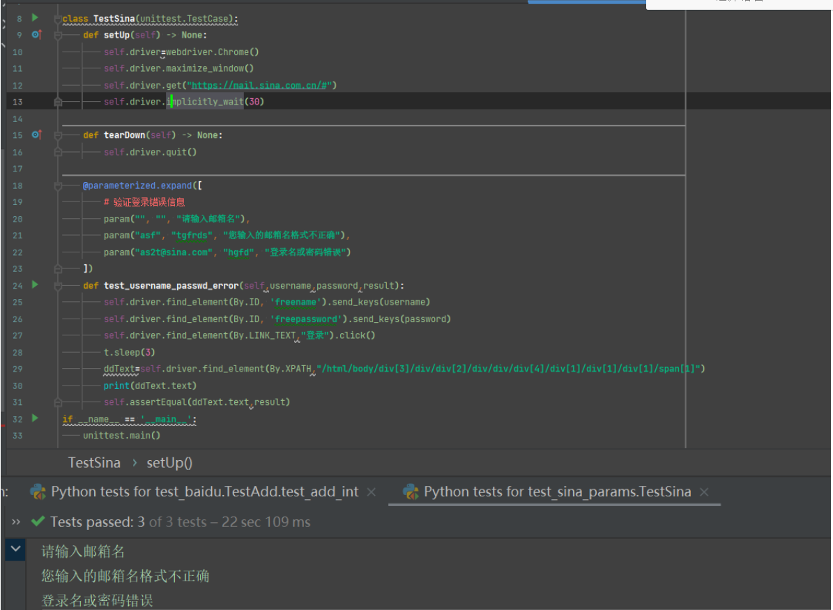 from selenium import webdriver import time as t from selenium.webdriver.common.by import By from parameterized import parameterized,param import unittest class TestSina(unittest.TestCase): def setUp(self) -> None: self.driver=webdriver.Chrome() self.driver.maximize_window() self.driver.get("https://mail.sina.com.cn/#") self.driver.implicitly_wait(30) def tearDown(self) -> None: self.driver.quit() @parameterized.expand([ # 验证登录错误信息 param("", "", "请输入邮箱名"), param("asf", "tgfrds", "您输入的邮箱名格式不正确"), param("as2t@sina.com", "hgfd", "登录名或密码错误") ]) def test_username_passwd_error(self,username,password,result): self.driver.find_element(By.ID, 'freename').send_keys(username) self.driver.find_element(By.ID, 'freepassword').send_keys(password) self.driver.find_element(By.LINK_TEXT,"登录").click() t.sleep(3) ddText=self.driver.find_element(By.XPATH,"/html/body/div[3]/div/div[2]/div/div/div[4]/div[1]/div[1]/div[1]/span[1]") print(ddText.text) self.assertEqual(ddText.text,result) if __name__ == '__main__': unittest.main()