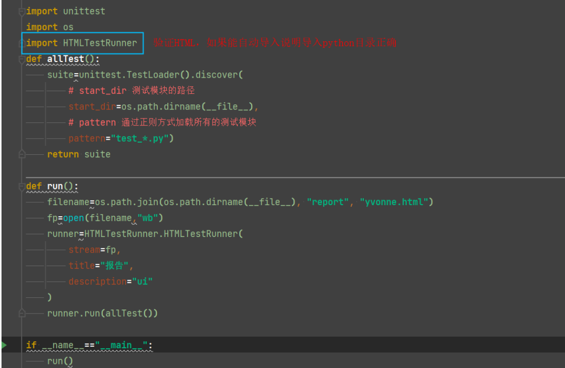 import unittest import os def allTest(): suite=unittest.TestLoader().discover( # start_dir 测试模块的路径 start_dir=os.path.dirname(__file__), # pattern 通过正则方式加载所有的测试模块 pattern="test_*.py") return suite