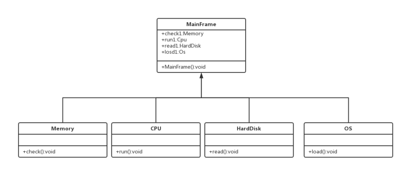 在计算机主机(Mainframe)中,只需要按下主机的开机按钮(on()),即可调用其他硬件设备和软件的启动方法 ,如内存(Memory)的自检(check())、CPU的运行(run())、硬盘(HardDisk)的读取(read())、操作系统(OS)的载入(load()),如果某一过程发生错误则计算机启动失败。