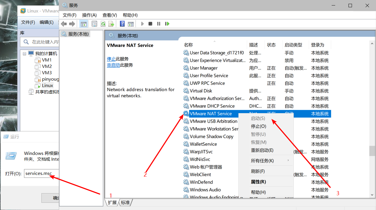 1查看主机中是否开启了虚拟机的服务,把相关的服务全部启动,例如下图