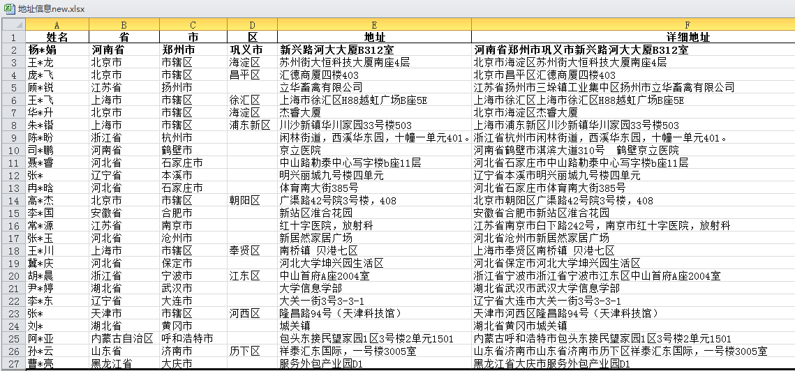看看新生成的表格:大功告成!cpca库很给力!