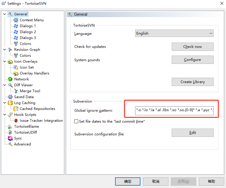 进入到SVN的设置页面,如上,设置Global ignore pattern的值为*.o *.lo *.la *.al .libs *.so *.so.[0-9]* *.a *.pyc *.pyo __pycache__ *.rej *~ #*# .#* .*.swp .DS_Store [Tt]humbs.db obj bin DebugRelease *.htm UpgradeLog.XML Backup _UpgradeReport_Files */bin/* */obj/*