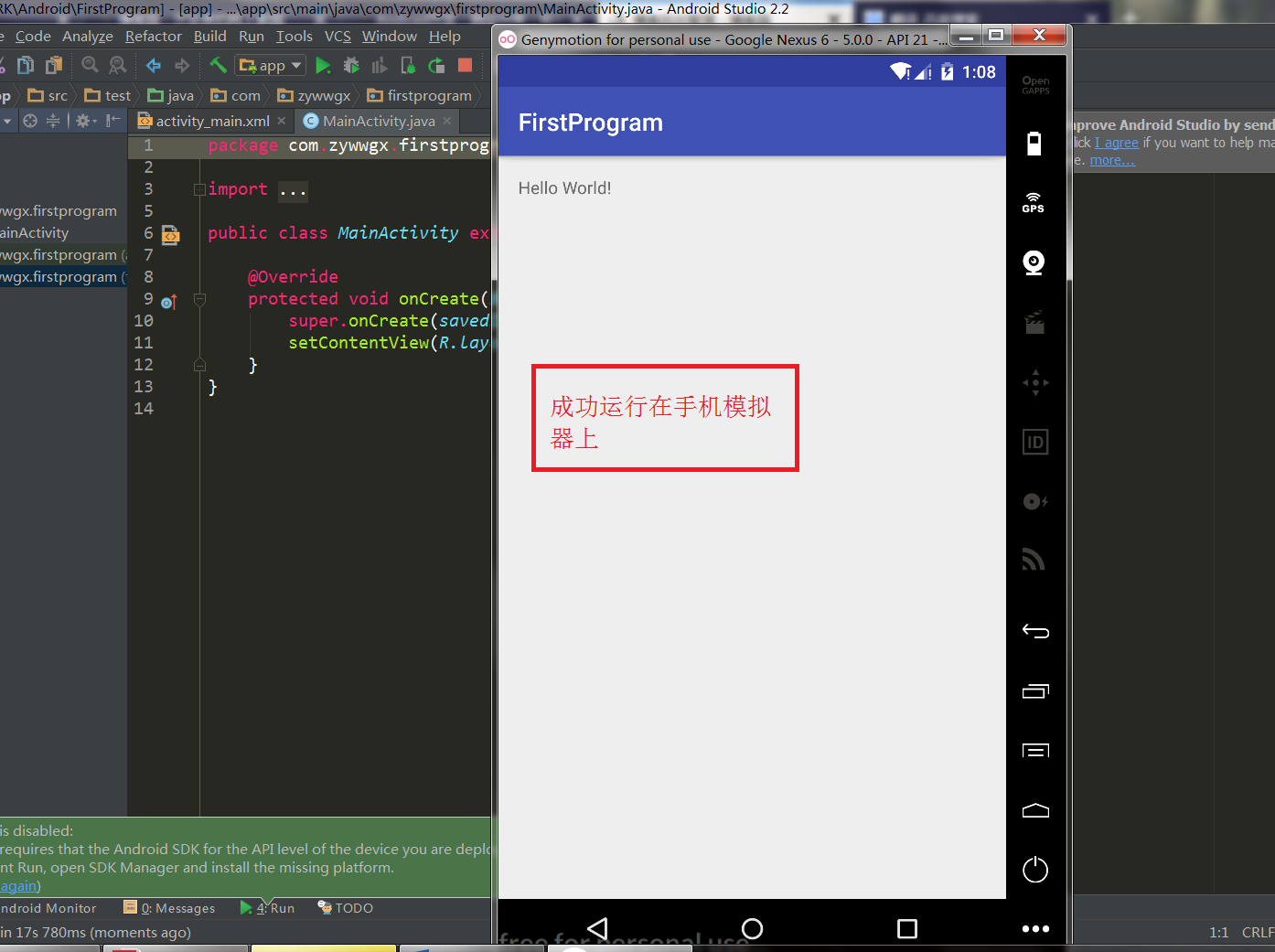 - 其实Android的功能不止于此,还有好多,这里我就不一一介绍了,下面就开始第一个小程序,开始之前,要先说明一下:我所使用的是Android Studio,模拟器是Genymotion,因为AS自带的模拟器有点慢,所以用了自己下载的模拟器。在这里我就先不说安装过程了,假如以后有幸得到你们的赏识,想知道具体的下载和安装操作,我会新建一个随记,分享我安装这些软件的过程,谢谢。