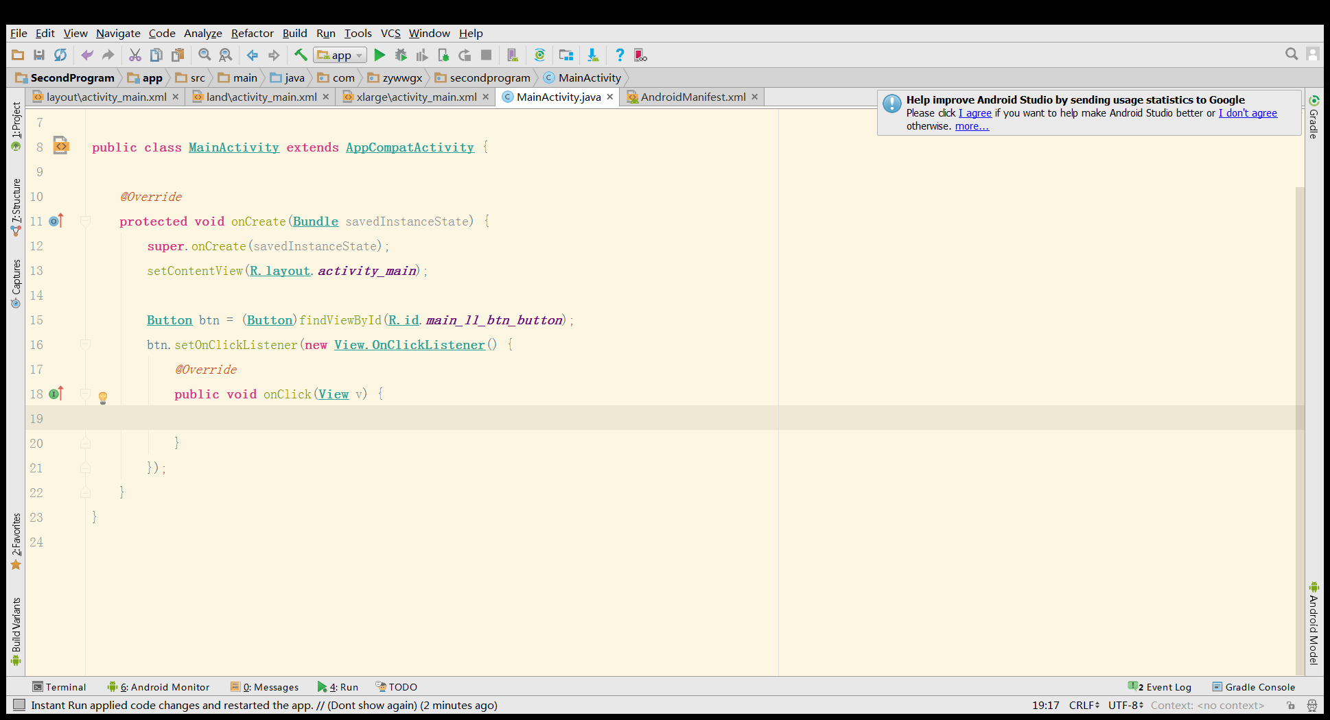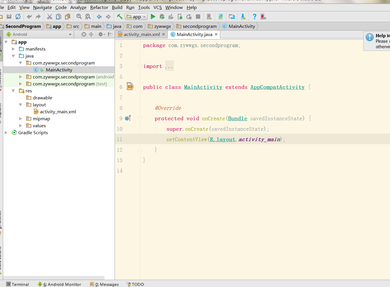 先新建一个空的工程,工程刚进去的时候有一个活动MainActivity,一个布局activity_main,然后它也已经自己注册过了。