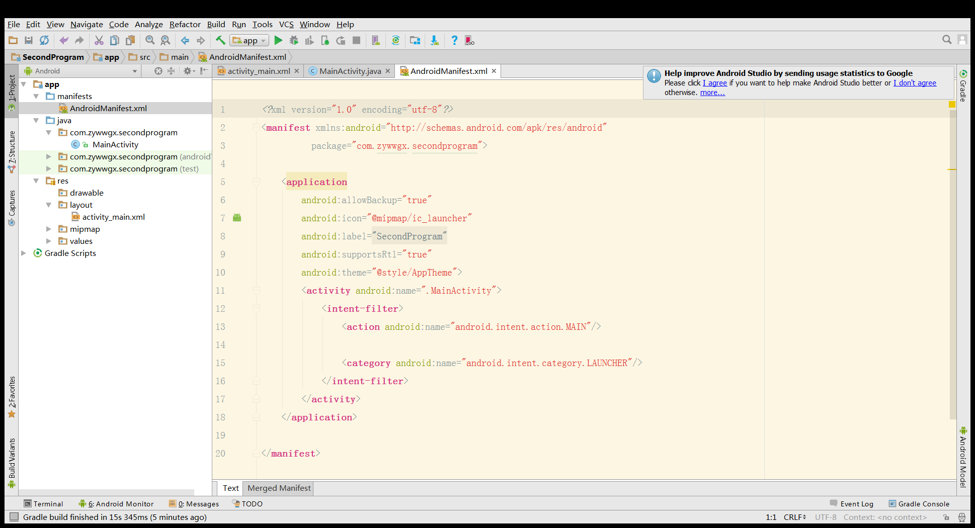 <action android:name="android.intent.action.MAIN"/>表示这个活动是主入口,打开应用程序就会先进入这个活动里面。而且这个只能设置一个,如果有多个,哪个在前执行哪个。
