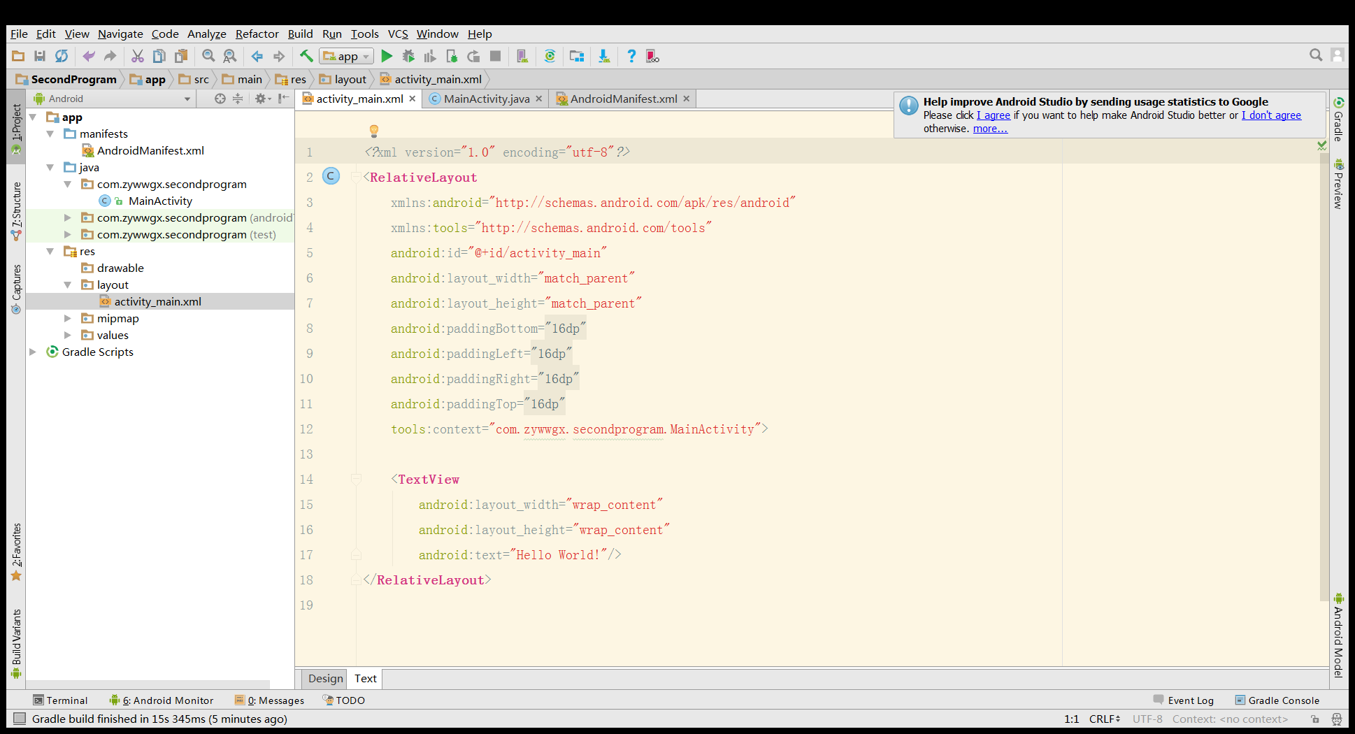 (2)这是一开始的布局,<RelativeLayout>是相对布局,这里呢我们删除掉这些,用线性布局来讲解。