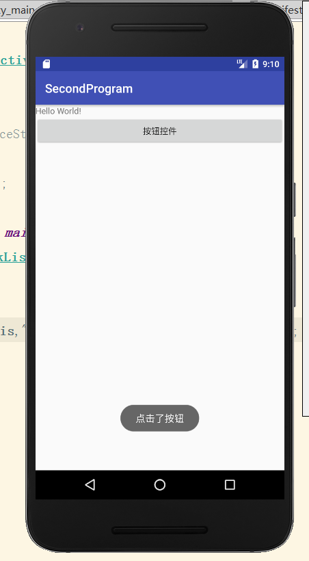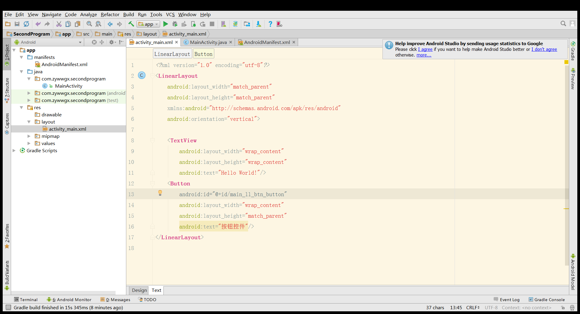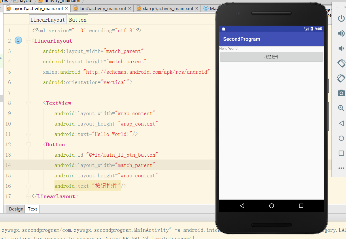 在<LinearLayout>里面的TextView和Button分别代表:输出的字,按钮。