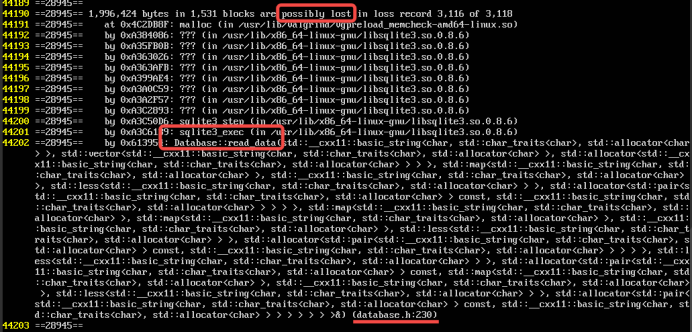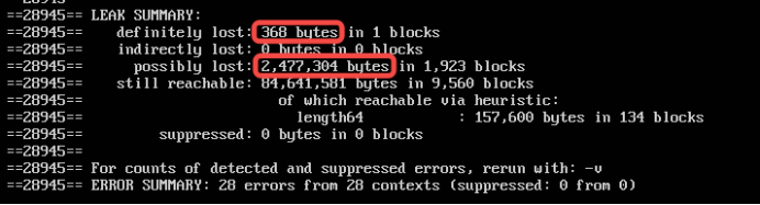 - Possibly lost: 可能的内存泄露(是指仍然存在某个指针能够访问某块内存,但该指针指向的已经不是该内存首地址。)