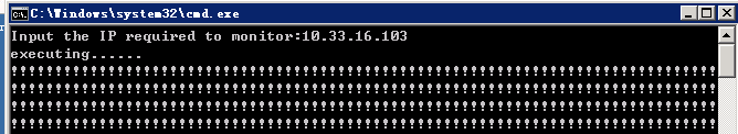 @echo off ::等待用户输入需要监控IP set /p ip=Input the IP required to monitor: echo executing...... :start echo|set /p ="!" ::将时间插入到日志文件 echo %date% %time% >>%ip%_log.txt ::findstr "Reply Request", 服务器端 ::find "来自", PC机端 ::测试结果插入到日志文件 ping -n 1 %ip% | find "来自" >>%ip%_log.txt ::调节结果输出的频率 ping 127.0.0.1 -n 4 >nul goto start pause