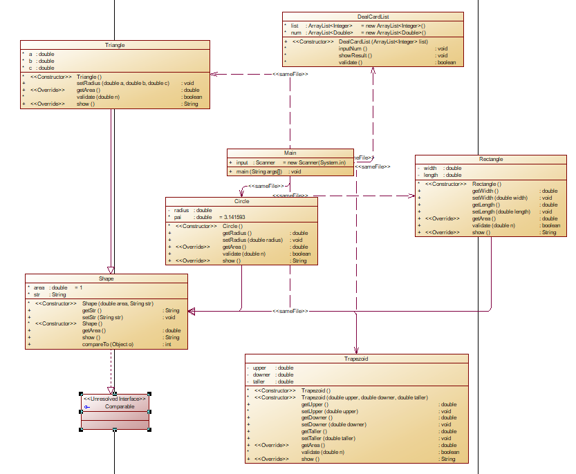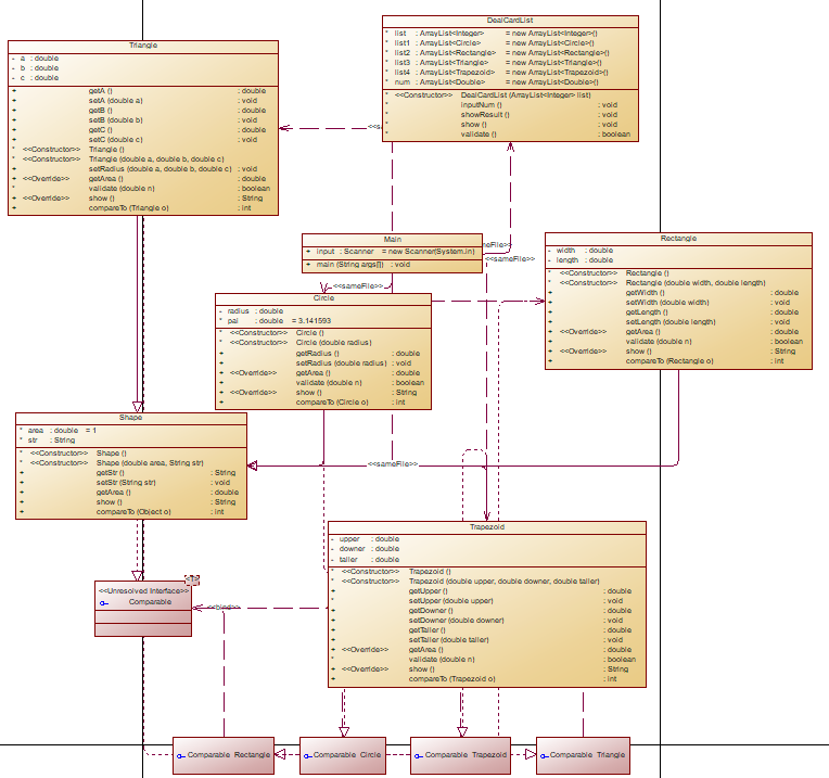 1 import java.util.*; 2 3 public class Main { 4 // 在Main类中定义一个静态Scanner对象,这样在其它类中如果想要使用该对象进行输入,则直接 5 // 使用Main.input.next…即可(避免采坑) 6 public static Scanner input = new Scanner(System.in); 7 8 public static void main(String[] args) { 9 ArrayList<Integer> list = new ArrayList<Integer>(); 10 int num = input.nextInt(); 11 while (num != 0) { 12 if (num < 0 || num > 4) { 13 System.out.println("Wrong Format"); 14 System.exit(0); 15 } 16 list.add(num); 17 num = input.nextInt(); 18 } 19 DealCardList dealCardList = new DealCardList(list); 20 dealCardList.showResult(); 21 if (dealCardList.validate()==false||list.size()==0) { 22 System.out.println("Wrong Format"); 23 System.exit(0); 24 } 25 dealCardList.show(); 26 } 27 } 28 class DealCardList { 29 ArrayList<Integer> list= new ArrayList<Integer>(); 30 ArrayList<Circle> list1= new ArrayList<Circle>(); 31 ArrayList<Rectangle> list2= new ArrayList<Rectangle>(); 32 ArrayList<Triangle> list3= new ArrayList<Triangle>(); 33 ArrayList<Trapezoid> list4= new ArrayList<Trapezoid>(); 34 35 36 DealCardList(ArrayList<Integer> list) { 37 this.list=list; 38 } 39 void showResult() { 40 for(Integer i:list) { 41 switch(i) { 42 case 1: 43 list1.add(new Circle(Main.input.nextDouble())); 44 break; 45 case 2: 46 list2.add(new Rectangle(Main.input.nextDouble(),Main.input.nextDouble())); 47 break; 48 case 3: 49 list3.add(new Triangle(Main.input.nextDouble(),Main.input.nextDouble(),Main.input.nextDouble())); 50 break; 51 case 4: 52 list4.add(new Trapezoid(Main.input.nextDouble(),Main.input.nextDouble(),Main.input.nextDouble())); 53 break; 54 } 55 } 56 } 57 void show() { 58 System.out.println("The original list:"); 59 int i1=0,i2=0,i3=0,i4=0; 60 System.out.print("["); 61 for(Integer i:list) { 62 switch(i) { 63 case 1: 64 System.out.print(Circle.show()+String.format("%.2f", list1.get(i1).getArea())+" "); 65 i1++; 66 break; 67 case 2: 68 System.out.print(Rectangle.show()+String.format("%.2f", list2.get(i2).getArea())+" "); 69 i2++; 70 break; 71 case 3: 72 System.out.print(Triangle.show()+String.format("%.2f", list3.get(i3).getArea())+" "); 73 i3++; 74 break; 75 case 4: 76 System.out.print(Trapezoid.show()+String.format("%.2f", list4.get(i4).getArea())+" "); 77 i4++; 78 break; 79 } 80 } 81 System.out.println("]"); 82 System.out.println("The Separated List:"); 83 System.out.print("["); 84 for (Circle i : list1) { 85 System.out.print(Circle.show()+String.format("%.2f", i.getArea())+" "); 86 } 87 System.out.print("]"); 88 System.out.print("["); 89 for (Rectangle i : list2) { 90 System.out.print(Rectangle.show()+String.format("%.2f", i.getArea())+" "); 91 } 92 System.out.print("]"); 93 System.out.print("["); 94 for (Triangle i : list3) { 95 System.out.print(Triangle.show()+String.format("%.2f", i.getArea())+" "); 96 } 97 System.out.print("]"); 98 System.out.print("["); 99 for (Trapezoid i : list4) { 100 System.out.print(Trapezoid.show()+String.format("%.2f", i.getArea())+" "); 101 } 102 System.out.println("]"); 103 System.out.println("The Separated sorted List:"); 104 Collections.sort(list1); 105 Collections.sort(list2); 106 Collections.sort(list3); 107 Collections.sort(list4); 108 double max1=0,max2=0,max3=0,max4=0; 109 System.out.print("["); 110 for (Circle i : list1) { 111 max1=max1+i.getArea(); 112 System.out.print(Circle.show()+String.format("%.2f", i.getArea())+" "); 113 } 114 System.out.print("]"); 115 System.out.print("["); 116 for (Rectangle i : list2) { 117 max2=max2+i.getArea(); 118 System.out.print(Rectangle.show()+String.format("%.2f", i.getArea())+" "); 119 } 120 System.out.print("]"); 121 System.out.print("["); 122 for (Triangle i : list3) { 123 max3=max3+i.getArea(); 124 System.out.print(Triangle.show()+String.format("%.2f", i.getArea())+" "); 125 } 126 System.out.print("]"); 127 System.out.print("["); 128 for (Trapezoid i : list4) { 129 max4=max4+i.getArea(); 130 System.out.print(Trapezoid.show()+String.format("%.2f", i.getArea())+" "); 131 } 132 System.out.println("]"); 133 double max=max1; 134 if(max2>max) { 135 max=max2; 136 } 137 if(max3>max) { 138 max=max3; 139 } 140 if(max4>max) { 141 max=max4; 142 } 143 System.out.println("The max area:"+String.format("%.2f",max)); 144 } 145 boolean validate() { 146 for(Circle i:list1) { 147 if(i.getRadius()<0) { 148 return false; 149 } 150 } 151 for(Rectangle i:list2) { 152 if(i.getLength()<0||i.getWidth()<0) { 153 return false; 154 } 155 } 156 for(Triangle i:list3) { 157 if(i.validate()==false) { 158 return false; 159 } 160 } 161 for(Trapezoid i:list4) { 162 if(i.getDowner()<0||i.getTaller()<0||i.getUpper()<0) { 163 return false; 164 } 165 } 166 return true; 167 } 168 } 169 170 class Shape{ 171 double area=1; 172 String str; 173 Shape(){ 174 } 175 Shape(double area,String str){ 176 this.setStr(str); 177 this.area=area; 178 } 179 public String getStr() { 180 return str; 181 } 182 public void setStr(String str) { 183 this.str = str; 184 } 185 public double getArea() { 186 return area; 187 } 188 // @Override 189 // public int compareTo(Object o) { 190 // // TODO 自动生成的方法存根 191 // Shape a=(Shape)o; 192 // if(this.area<a.area) return 1; 193 // if(this.area>a.area) return -1; 194 // return 0; 195 // } 196 } 197 class Circle extends Shape implements Comparable<Circle>{ 198 private double radius; 199 Circle(){ 200 } 201 Circle(double radius){ 202 this.setRadius(radius); 203 } 204 public double getRadius() { 205 return radius; 206 } 207 public void setRadius(double radius) { 208 this.radius = radius; 209 } 210 public double getArea() { 211 super.area=radius*radius*Math.PI; 212 return radius*radius*Math.PI; 213 } 214 public static String show() { 215 return "Circle:"; 216 } 217 public int compareTo(Circle o) { 218 // TODO 自动生成的方法存根 219 if(this.area<o.area) return 1; 220 if(this.area>o.area) return -1; 221 return 0; 222 } 223 } 224 class Rectangle extends Shape implements Comparable<Rectangle>{ 225 private double widt