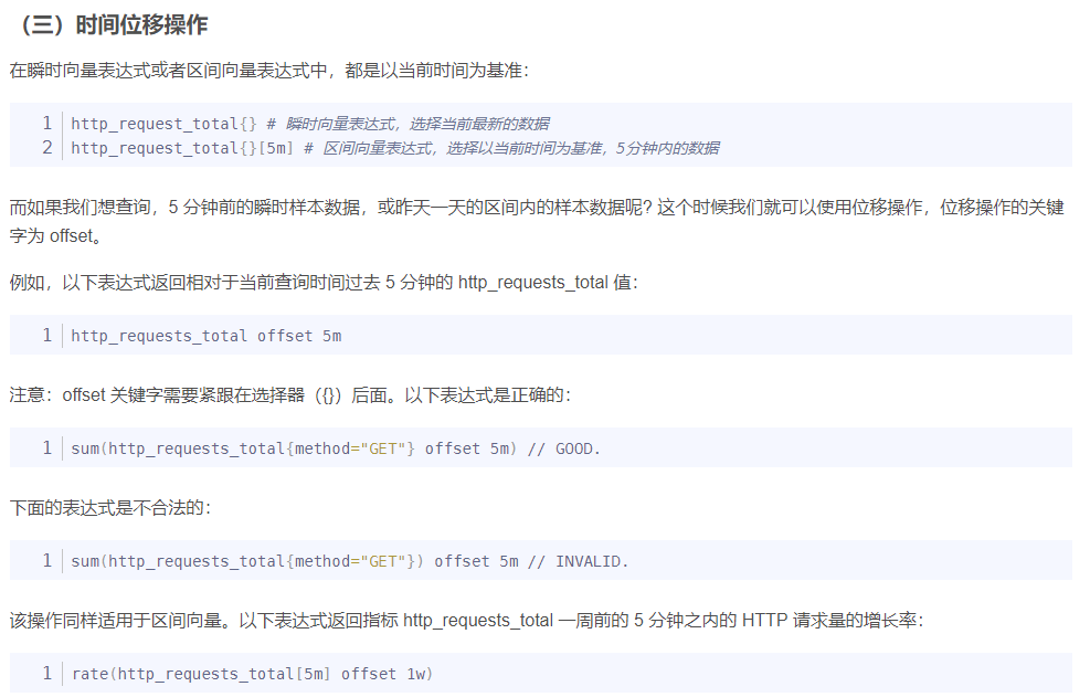 使用瞬时向量表达式能够获取到一个包含多个时间序列的集合,我们称为瞬时向量