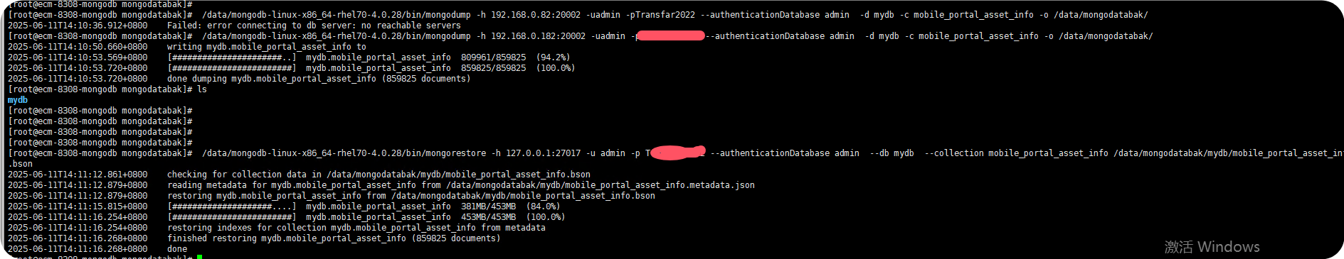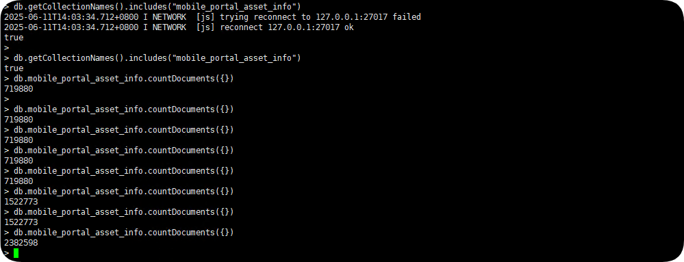 单表备份 /data/mongodb-linux-x86_64-rhel70-4.0.28/bin/mongodump -h 192.168.0.182:20002 -uadmin -pTransfar2022 --authenticationDatabase admin -d mydb -c mobile_portal_asset_info -o /data/mongodatabak/ /data/mongodb-linux-x86_64-rhel70-4.0.28/bin/mongodump -h 192.168.0.17:20003 -uadmin -pTransfar2022 --authenticationDatabase admin -d mydb -c mobile_portal_asset_info -o /data/mongodatabak/ /data/mongodb-linux-x86_64-rhel70-4.0.28/bin/mongodump -h 192.168.0.205:20001 -uadmin -pTransfar2022 --authenticationDatabase admin -d mydb -c mobile_portal_asset_info -o /data/mongodatabak/ 单表恢复 cd /data/mongodatabak /data/mongodb-linux-x86_64-rhel70-4.0.28/bin/mongorestore -h 127.0.0.1:27017 -u admin -p Transfar2022 --authenticationDatabase admin --db mydb --collection mobile_portal_asset_info /data/mongodatabak/mydb/mobile_portal_asset_info.bson 查看最新数据 db.getCollectionNames().includes("mobile_portal_asset_info") db.mobile_portal_asset_info.countDocuments({})