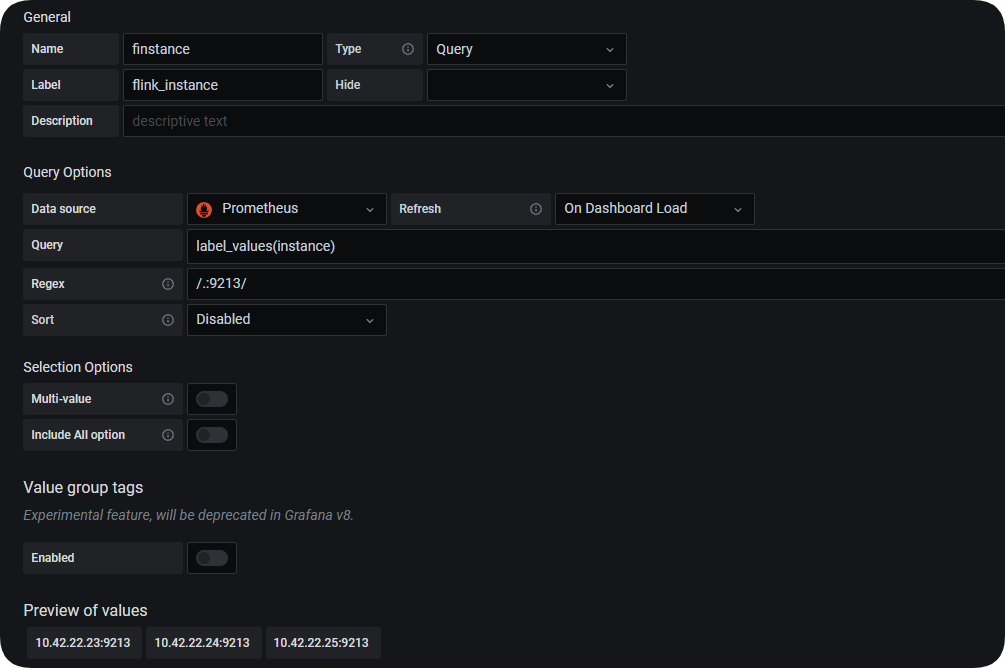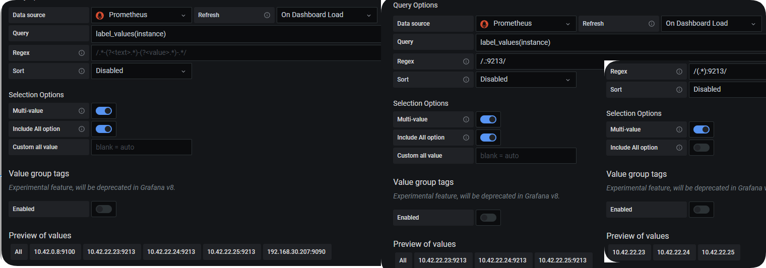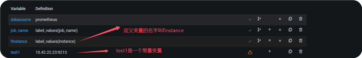instance这个变量在grafana中定义后不生效,需要定义一个另外名称的变量名称.此处不生效是因为grafana内部已经用了这个instance做了内置变量