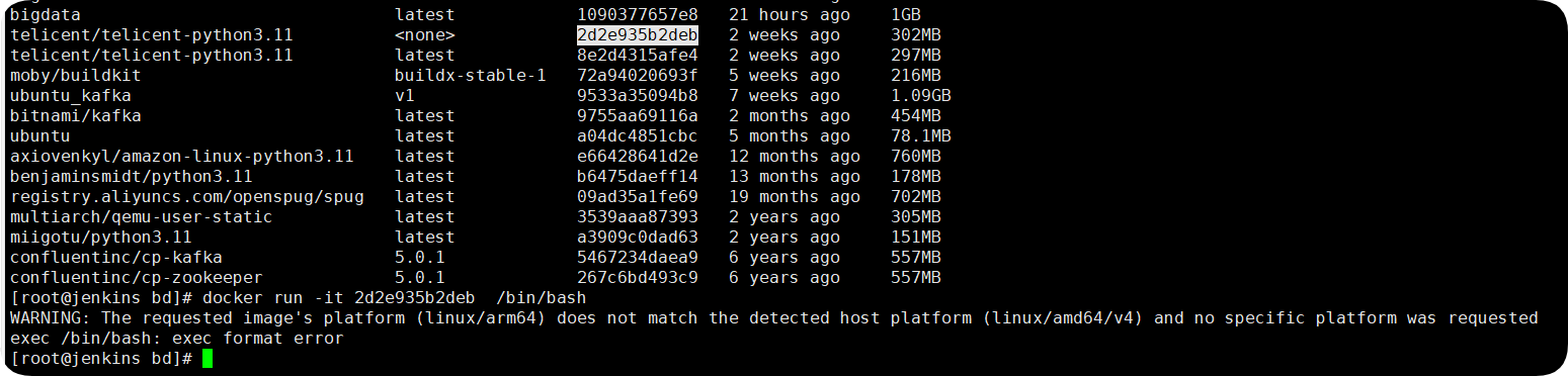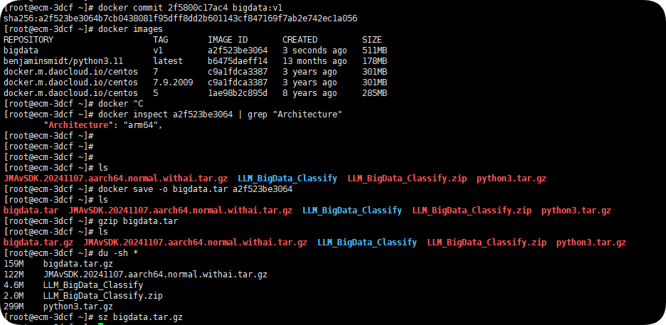 docker cp /root/LLM_BigData_Classify/LLM_BigData_Classify 2f5800c17ac4:/home/user/ cd LLM_BigData_Classify/ (app-venv) [user@2f5800c17ac4 LLM_BigData_Classify]$ pip3 install -r requirements.txt -i https://pypi.doubanio.com/simple/ pip3 install -r requirements.txt -i https://pypi.doubanio.com/simple/ docker commit 2f5800c17ac4 bigdata:v1 docker save -o bigdata.tar a2f523be3064 gzip bigdata.tar docker run --network=host -ti bigdata:v1 /bin/sh /home/user/LLM_BigData_Classify/startweb.sh docker inspect your-image:tag | grep "Architecture"