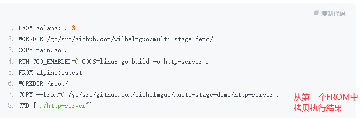 使用第二个FROM命令表示镜像构建的第二阶段,使用COPY指令拷贝编译后的文件到alpine 镜像中.--from=0表示从第一阶段构建结果中拷贝文件到当前构建阶段