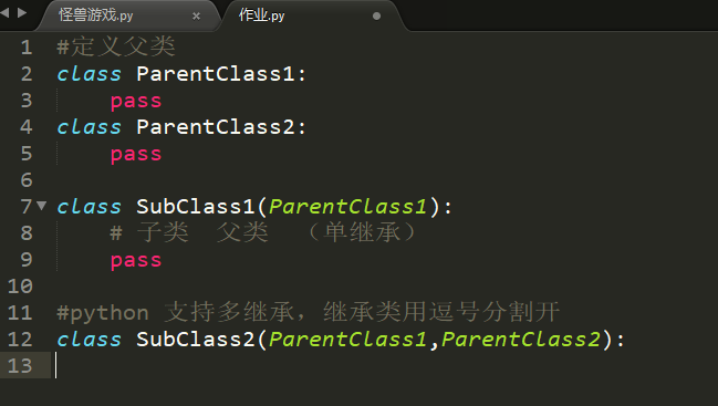 1.继承:是一种创建新类的方式,在python中,新建的类可以继承一个或多个父类,父类有称为基类或超类,新建的类称为子类或派生类