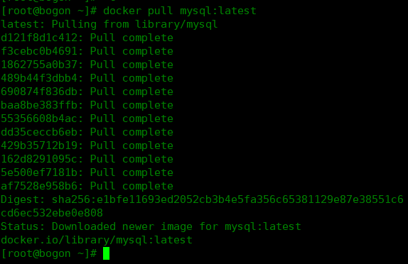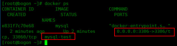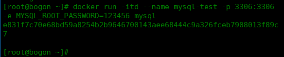 [root@bogon ~]# docker run -itd --name mysql-test -p 3306:3306 -e MYSQL_ROOT_PASSWORD=123456 mysql