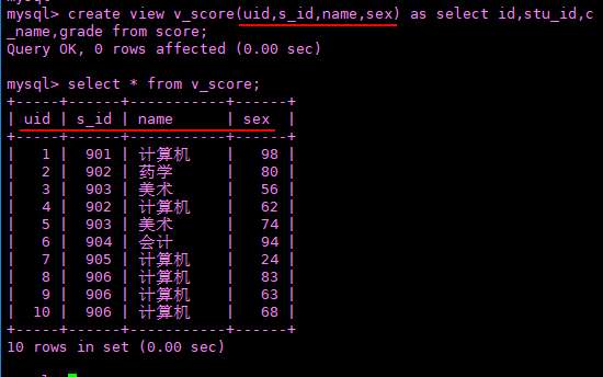 create 【or replace】 view 视图名称 (user _id,username,sex) ----括号里是想让用户看到的列名名称(为视图字段指定别名)