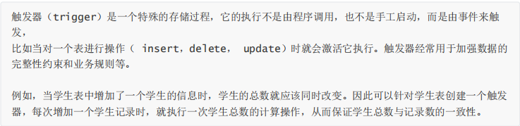 触发器(trigger)是一个特殊的存储过程,它的执行不是由程序调用,也不是手工启动,而是由事件来触发,比如当对一个表进行操作( insert,delete, update)时就会激活它执行。(一般很少用查询做触发,因为查询太频繁)