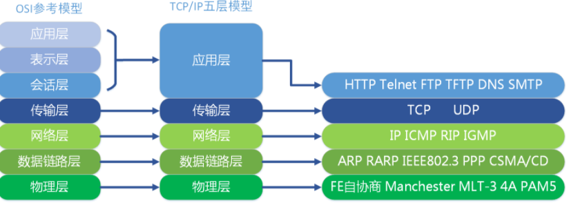 应用层协议:http(80)、telnet(23)、dns(53)、ftp(20/21)、smtp(25)、pop3(110)