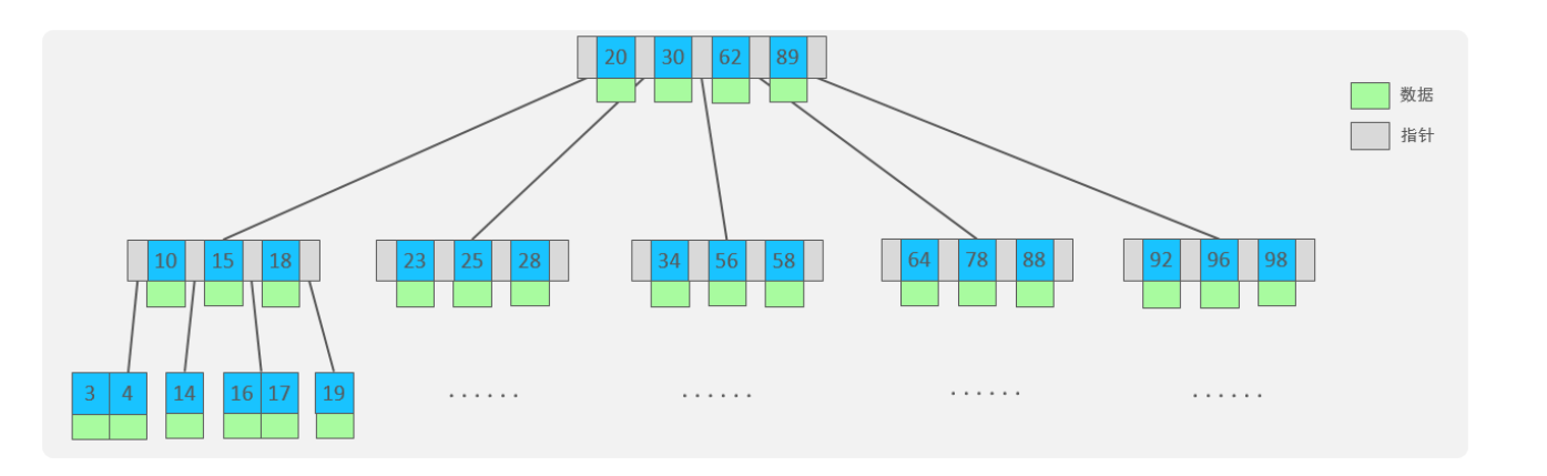 - 在B树中,非叶子节点和叶子节点都会存储数据