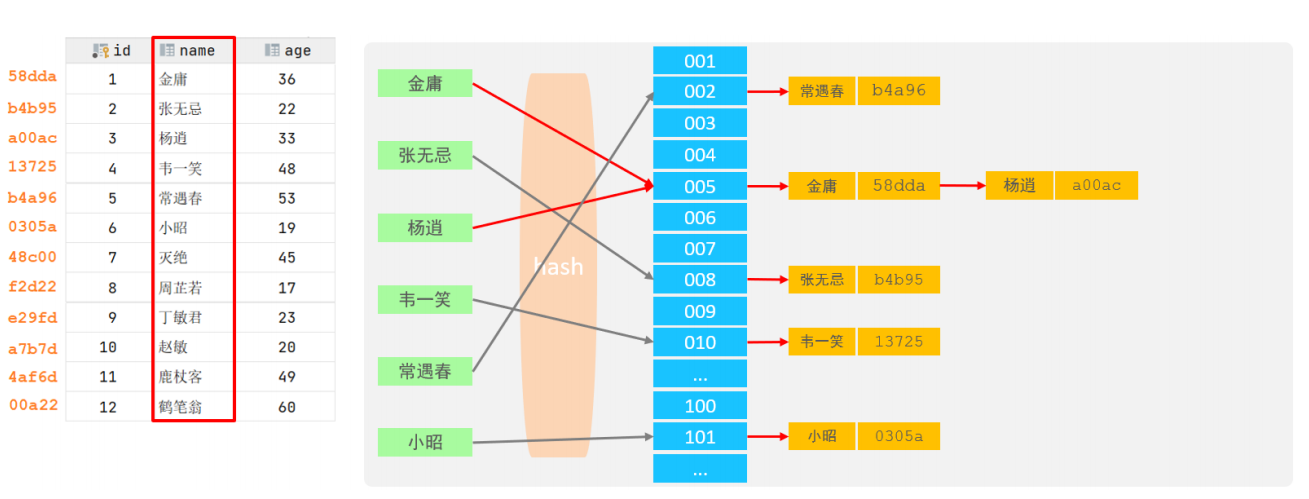 - 查询效率高,通常(不存在hash冲突的情况)只需要一次检索就可以了,效率通常要高于B+tree索引