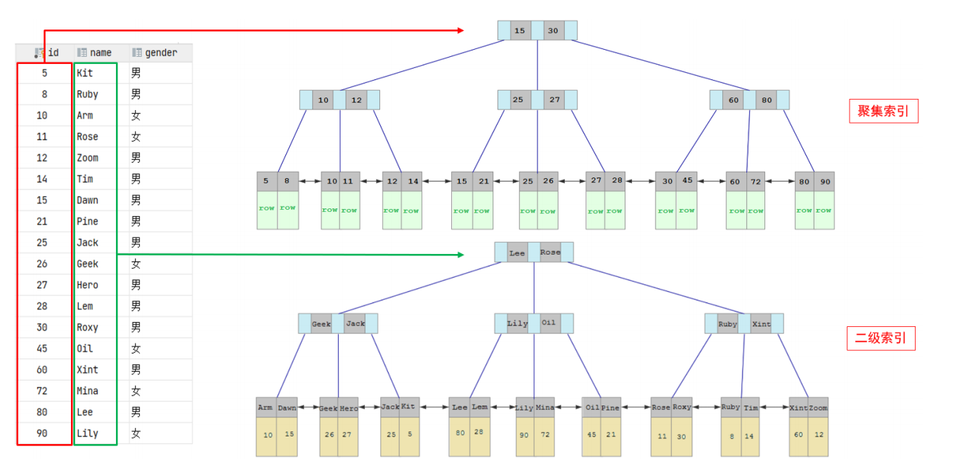 聚集索引和二级索引的具体结构如下: