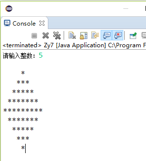 1 package teset; 2 3 import java.util.Scanner; 4 5 public class Zy7 { 6 7 public static void main(String[] args) { 8 9 Scanner sc = new Scanner(System.in); 10 System.out.print("请输入整数:"); 11 int inputNumber=sc.nextInt(); 12 System.out.println(); 13 14 for(int i=1;i<=inputNumber;i++) 15 { 16 for(int j=inputNumber-i;j>0;j--) 17 { 18 System.out.print(" "); 19 } 20 for(int k=0;k<2*i-1;k++) 21 { 22 System.out.print("*"); 23 } 24 25 System.out.println(); 26 } 27 28 for(int i=inputNumber; i>0 ;i--) 29 { 30 for(int j=inputNumber-i+1; j>0; j--) 31 { 32 System.out.print(" "); 33 } 34 for(int k=0; k < 2*i-3; k++) 35 { 36 System.out.print("*"); 37 } 38 System.out.println(); 39 } 40 41 sc.close(); 42 } 43 44 }