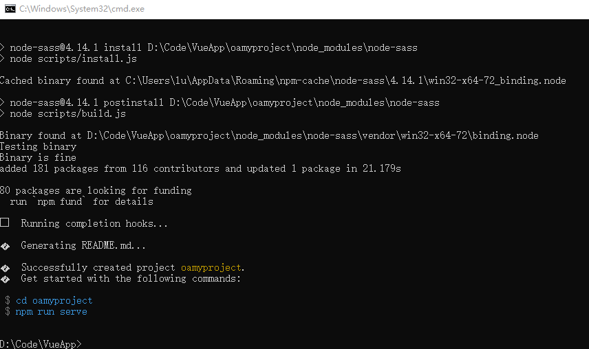 我们可以输入cd 命令 进入项目文件夹 cd oamyproject,然后输入 npm run serve 运行vue项目