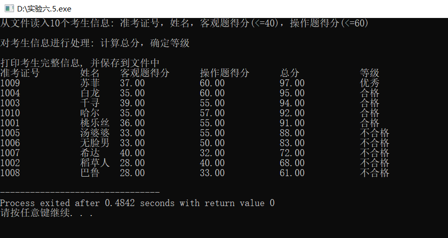 // 输出考生完整信息: 准考证号,姓名,客观题得分,操作题得分,总分,等级