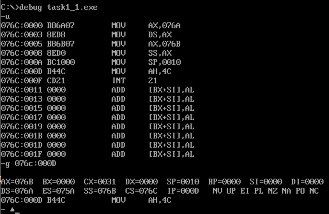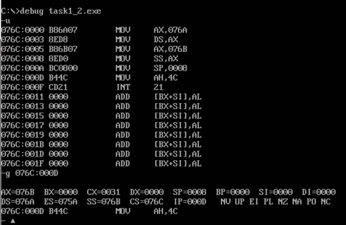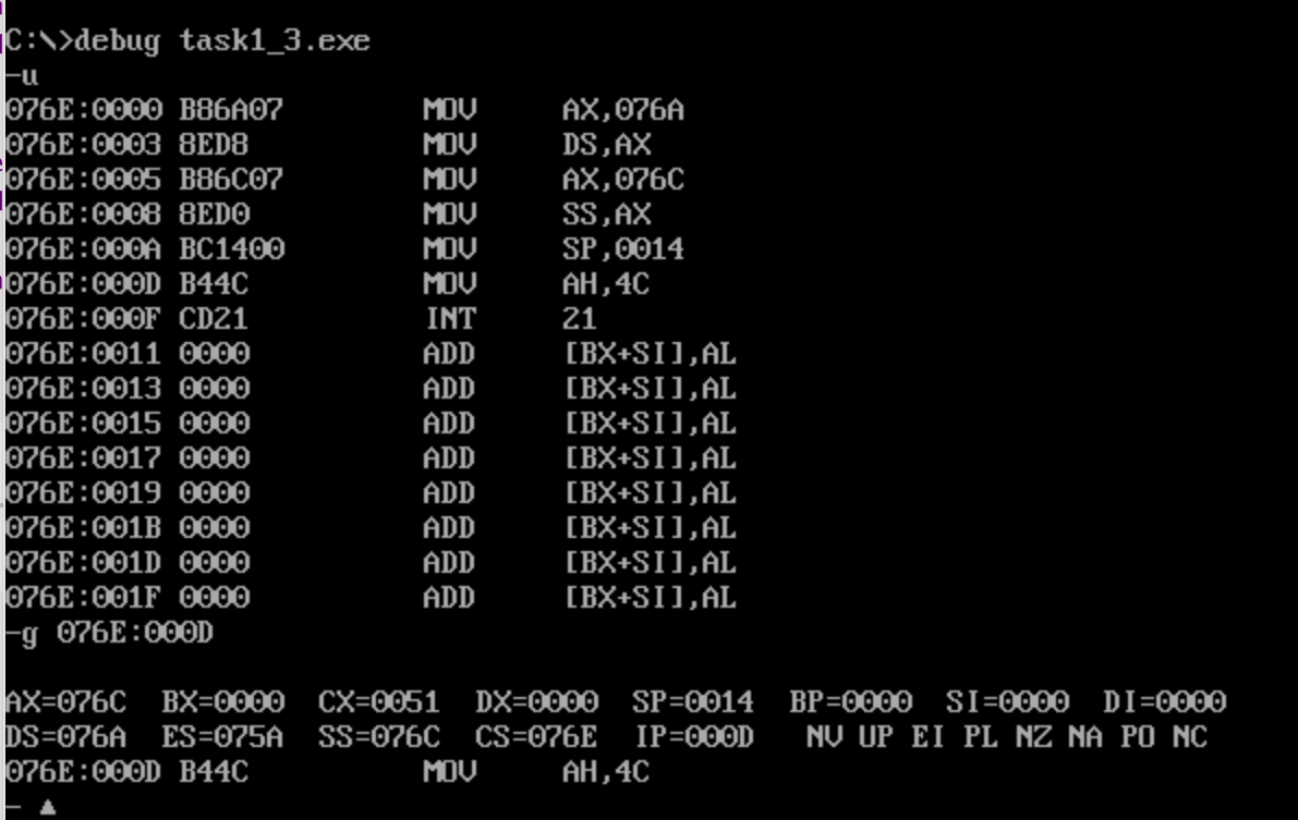 ② 在debug中加载、反汇编、调试。在数据项依次相加前,和相加后,分别查看三个逻辑段data1,