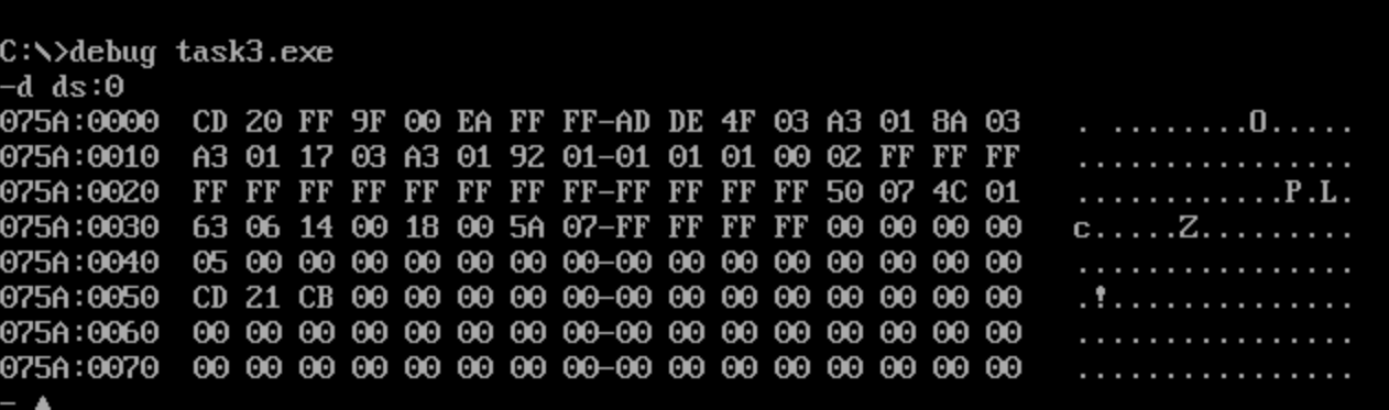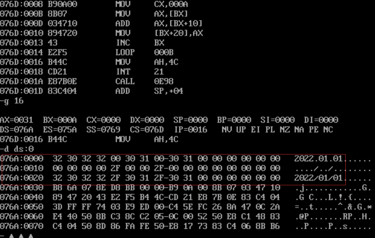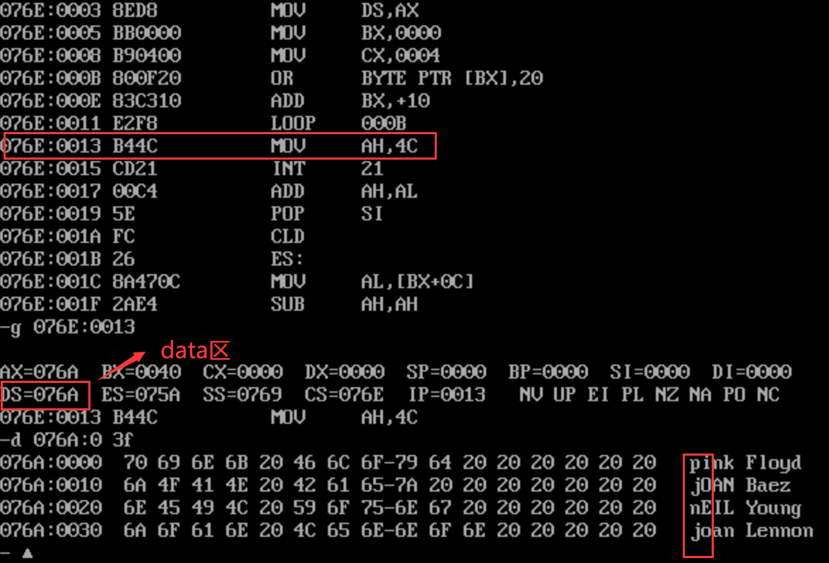 ② 在debug中加载程序,反汇编,执行到line13退出前,用d命令查看data段对应的内存空间,确认每