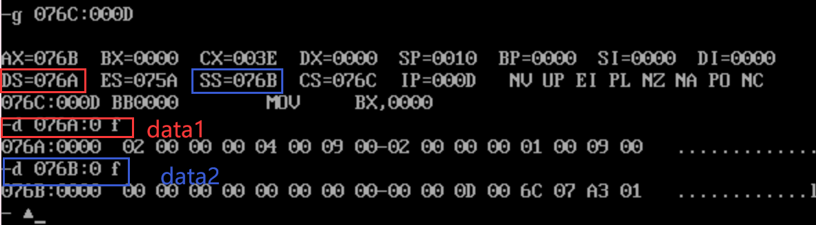 data2, data3对应的内存空间,确认逐一相加后,结果的确保存在了逻辑段data3中。