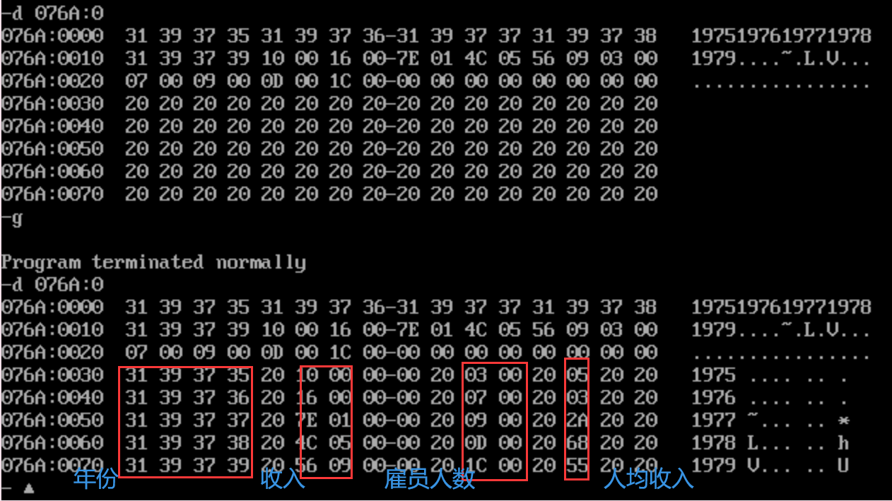 由上图d命令查看信息可知,信息已按要求结构化地写入到了指定的内存中。