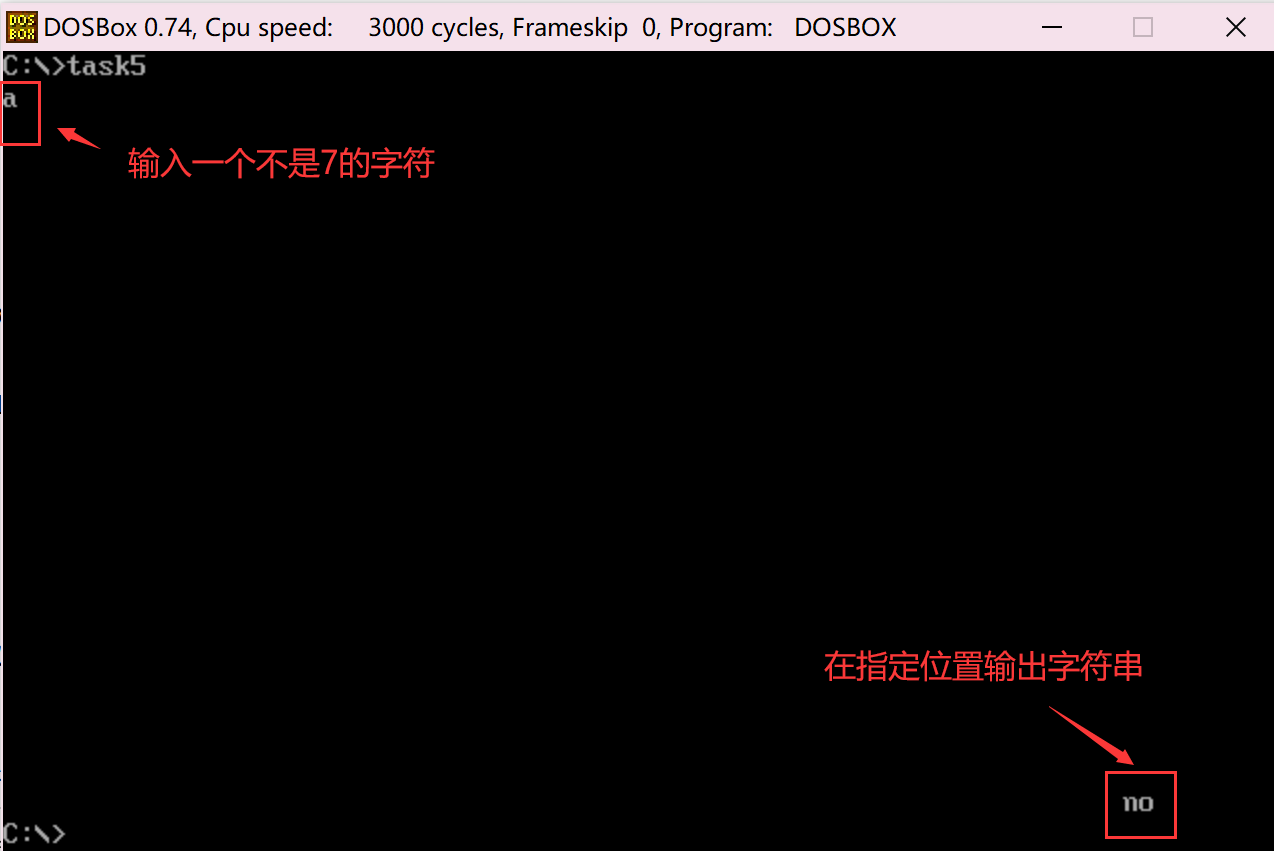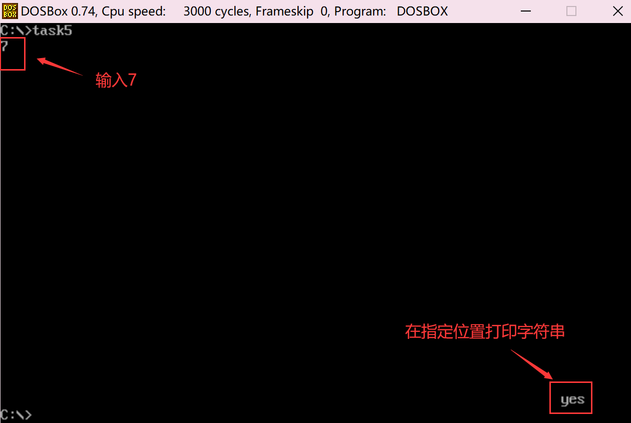功能:从键盘输入一个字符,如果为'7',则在指定的24行,70列输出'yes';否则在指定位置输出'no'。