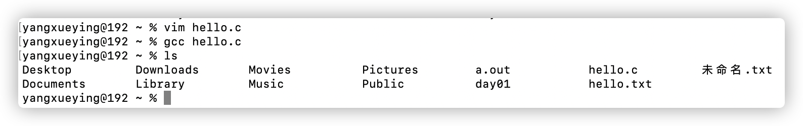 输入gcc hello.c进行编译