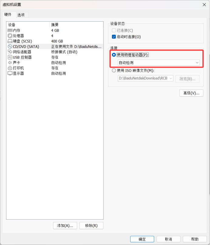 将CD/DVD(SATA)改成使用物理驱动器,如下图所示: