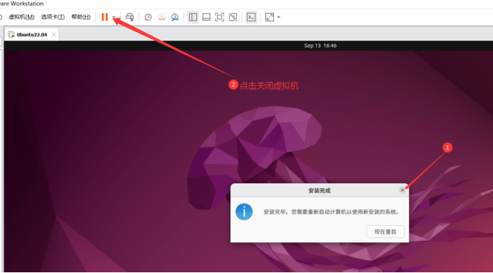 安装完成后,不要点击“现在重启”,直接点击关闭虚拟机,如下图: