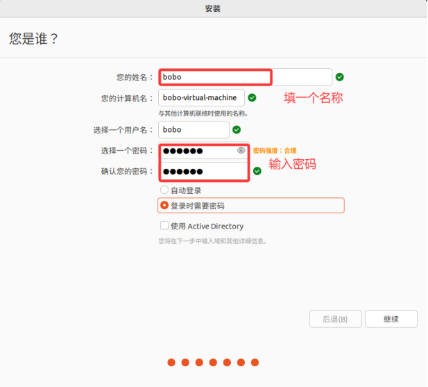 输入虚拟机用户名称,设置一个密码,点击继续安装即可,如下图: