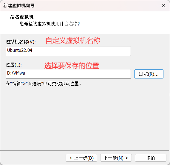 自定义虚拟机名称,保存位置(注意:选择存储空间较大的盘符,不要安装到C盘)