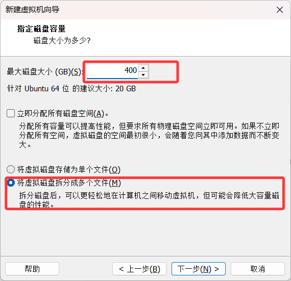 磁盘大小一般选择400G以上,选择将虚拟磁盘拆分成多个文件(M)