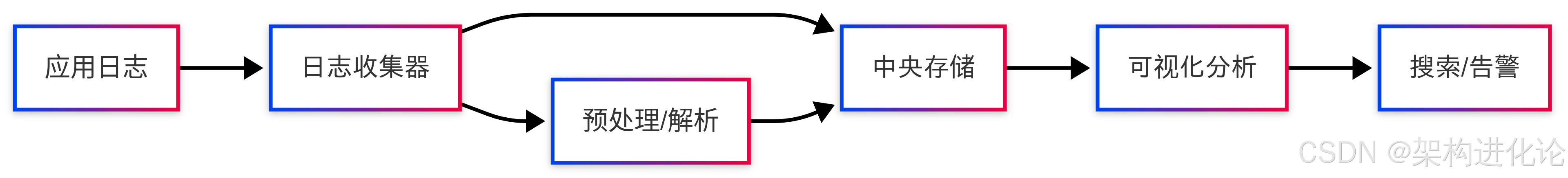 在微服务架构下,日志收集面临新的挑战:日志数据分散在各个节点,需要统一的收集、存储和分析方案。现代日志系统通常采用以下架构: