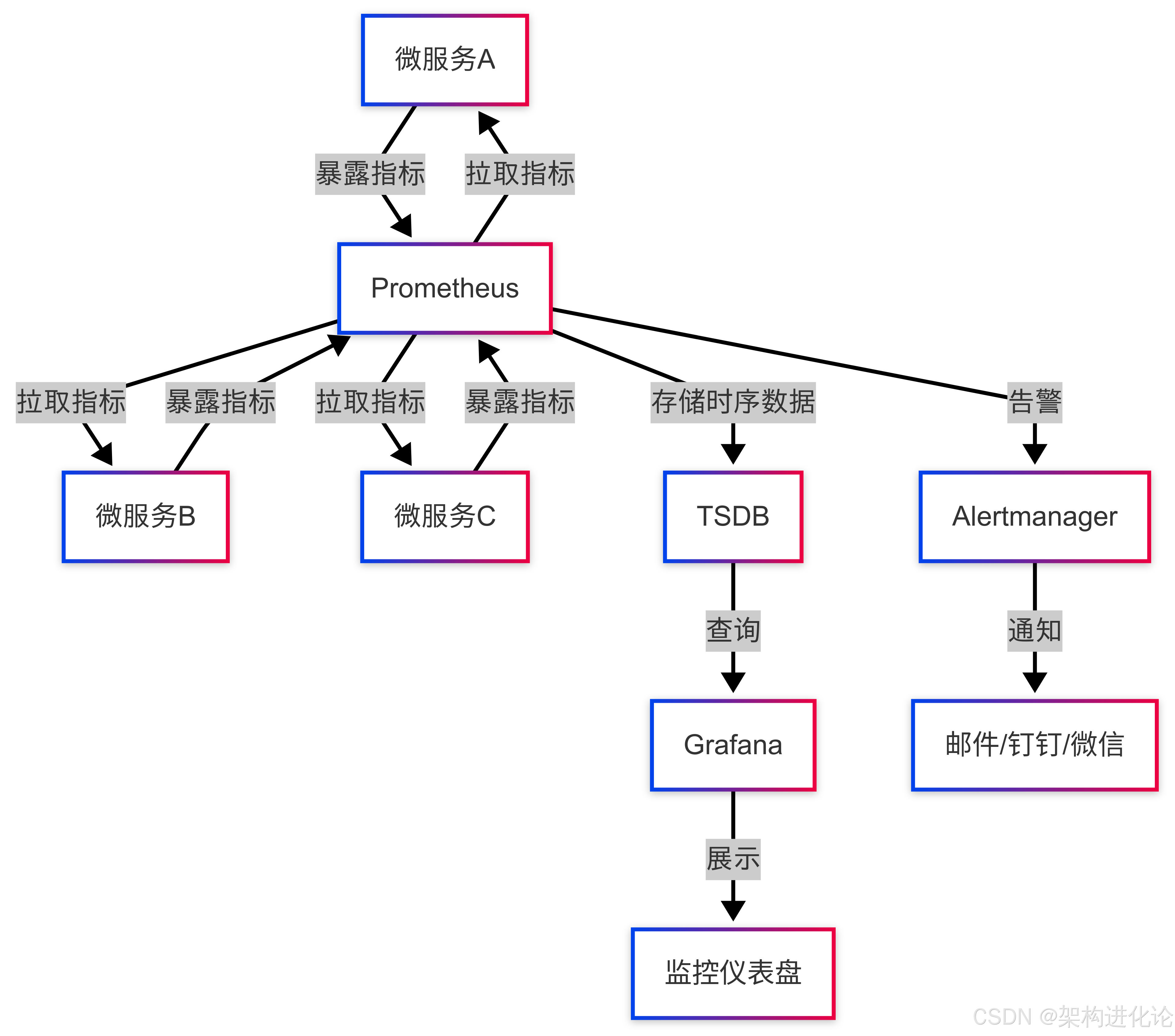 指标是数值型的测量数据,表示系统在特定时间点的状态或性能情况。与日志不同,指标通常是聚合数据,占用空间小,查询速度快,非常适合实时监控和告警。